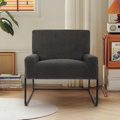 LSSBOUGHT Sherpa Accent Chair, Modern Upholstered Single Sofa with Metal Legs, Teddy Barrel Arm Chair for Reading, Living Room, Bedroom, Office, Gray