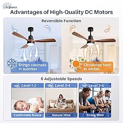 Sophisticated Functionality & Seamlessly Integrated - A fusion of modern design and intelligent engineering. With striking solid wood 3-blades downrod design, generate 4,500 CFM of powerful yet refined airflow, effortlessly circulating air through space up to 16x16ft. Paired with integrated LED, this smart ceiling fan with light transforms rooms into oases of adaptable comfort—whether casting a warm evening glow or delivering refreshing breezes on demand. Unified Smart Control System - Voice-control via Alexa delivers hands-free convenience, while Google Assistant app allows adjustments from anywhere. Prefer tactile simplicity?The included remote operates independently or mounts as a wall switch. Triad of control options of smart ceiling fans ensure your ideal climate and lighting are always within reach—no interruptions to relaxation or productivity. Dynamic Climate Mastery - Sofucor 48 inch ceiling fans with high-efficiency DC motor, offering 6 precision-tuned wind modes - from sleep-friendly whispers to vigorous cooling gusts. Beyond summer comfort, the innovative reversal function solves winter’s "overhead heat trap" by recycling warm air downward, reducing heating costs by up to 10% while maintaining consistent warmth floor-to-ceiling. Versatility Indoors & Outdoor Ceiling Fan - Engineered for universal adaptability, our low profile ceiling fans with lights include three downrods (5", 10", 24") and ±15° tilt capability to accommodate vaulted ceilings or low profiles. Damp-rated ceiling fan 's construction permits installation in covered patios, gazebos, and breezeways, while its refined aesthetic of ceiling fan enhances living rooms, kitchens, or home offices. (Note: Recommend rain-protected outdoor placement) Whisper-Quiet Experience - Sofucor ceiling fans with lights alexa at just 35dB in standard operation (quieter than library ambiance) and a 30dB "deep sleep" mode, vibration-free technology ensures silent airflow, perfect for nurseries, light sleepers, or focused work spaces without disruptive hum. Fully Adjustable Lighting - Customize both the brightness level and color temperature to perfectly suit any activity or atmosphere. Choose from Warm White (3000K), Natural White (4000K), or Cool White (6000K), and dim the light to your desired intensity, all effortlessly adapting to your requirements. Buy with Confident - Easy self-installation with detailed guides & videos. 24/7 tech support included! Sofucor's ceiling fans are ETL/FCC certified, featuring a lifetime motor warranty and 2-year protection. Choose us for quality and reliability.