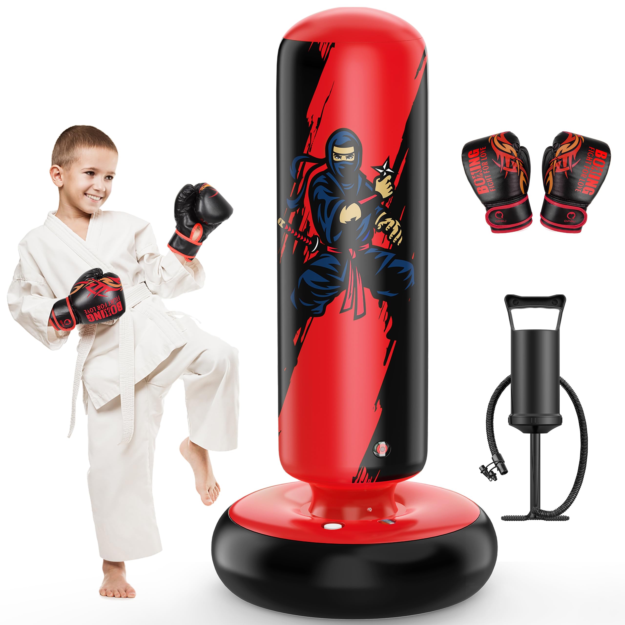 Are your little ones full of energy and looking for a fun way to channel it? Look no further! Introducing QPAU Inflatable Punching Bag from Fight for Love boxing series for kids to live an active and entertained childhood to protect their family. This colorful karate punching bag sizes is 66 inches for kids aged 6 to 12. It's a great size for practicing boxing skills and spend fun time with family. At QPAU we value the safety of the children. This durable blow up punching bag is made from sturdy PVC material, ensuring hours of safe and energetic play for your little champions. To ensure the stability when playing fill the base with water to keep it firmly in place, even during the most enthusiastic punches! With each QPAU kids punching bag, you get a pair of boxing gloves, specially sized for small hands. It's nice for indoor playrooms or even outdoor spaces. Your kids will feel like real boxing champions! QPAU Inflatable Standing Punching Bag for Kids is the ultimate accessory for active playtime and teaching your kids to “Fight for Love”.