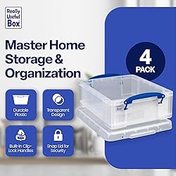 - Become a true master of home storage and organization with the unbeatable reliability of the 4 Really Useful Box Storage Containers. These spacious 8.1-liter bins are tailor-made to cater to all your organizing needs, seamlessly accommodating a diverse array of items in your home or office. Efficiency is at the forefront, as the transparent design allows you to swiftly identify the contents of each plastic storage bins at a mere glance, eliminating the need to open them and thereby saving you precious time and effort. Transporting your essentials becomes a hassle-free task with the inclusion of convenient clip-lock handles, ensuring ease of mobility wherever you need to go. The snap lid mechanism of these storage containers with lids not only secures the contents within but also provides a protective barrier, minimizing the risk of accidental spills or untimely messes. Crafted from durable plastic, these clear storage bins with lids are built to withstand the test of time, guaranteeing long-lasting use even with regular handling and storage demands. The 8.1-liter capacity offers ample space for a myriad of items, be it office supplies, cherished photos, or beloved small toys, all while maintaining a compact footprint in your living space. Embrace a simplified lifestyle by incorporating the set of 4 Plastic Storage Containers from Really Useful Box into your routine. This practical storage solution seamlessly combines functionality, durability, and a touch of style, ensuring your space remains organized with utmost convenience.