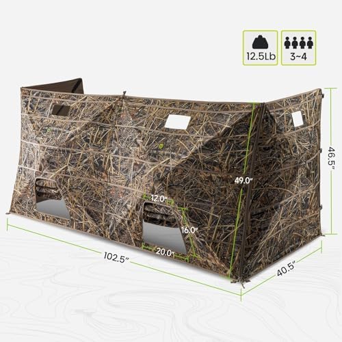- Built to Withstand Harsh Conditions: Crafted from rugged 500D+ polyester fabric with sturdy 10mm fiberglass poles, metal hubs, and reinforced corners. Tie-down straps and floor loops help anchor the blind securely, while the tough build resists strong winds and wet weather during waterfowl season