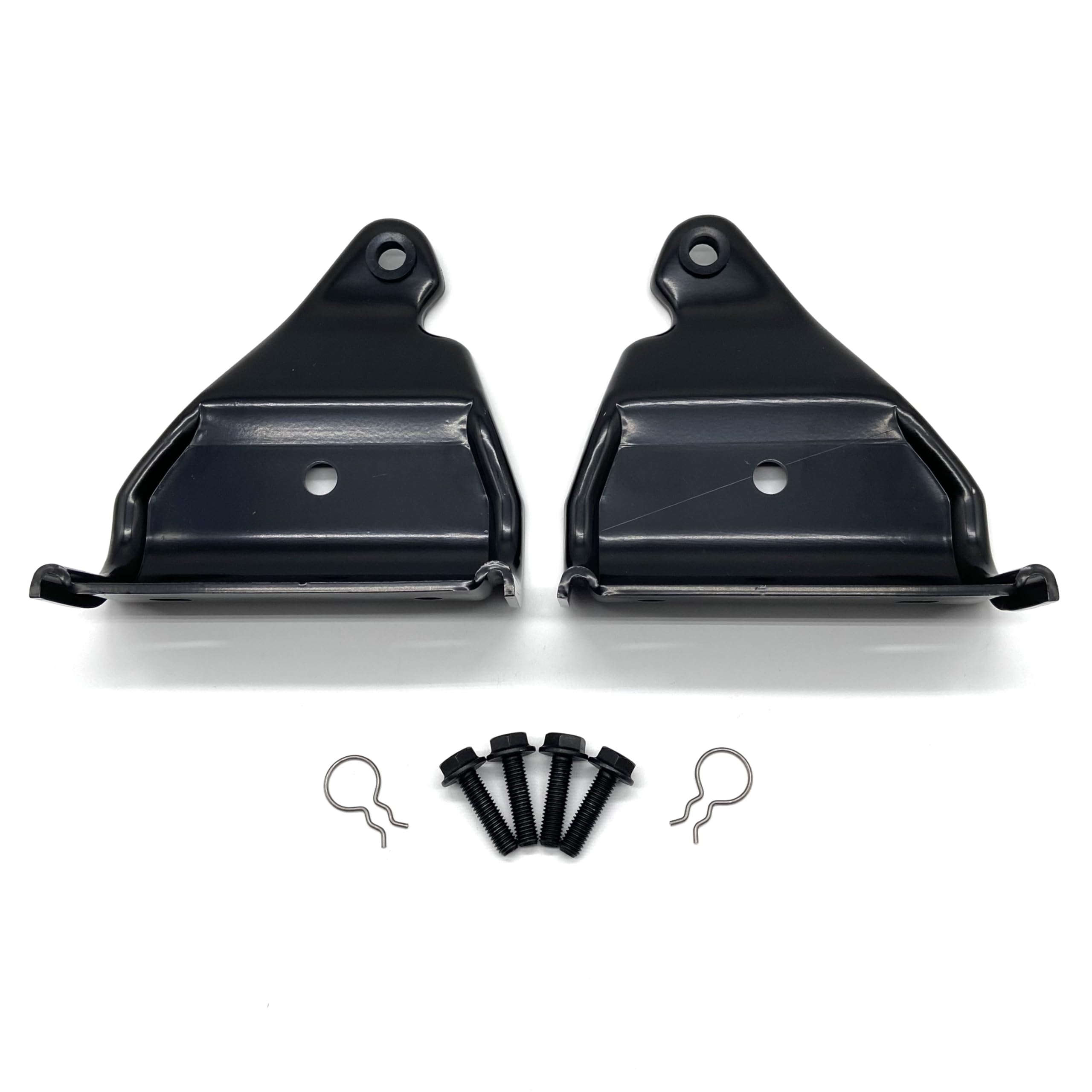 Brand new set of 2 rear seat forward floor mount brackets and all the hardware compatible with Jeep Wrangler YJ's 1987-1995 and 1976-1986 CJ's with the fold and tumble back seat. Brackets are black powder coated 1/4" thick steel. Hardware includes: 4 Grade 8 black flange bolts to attach the brackets to the floor of the tub, and 2 nylon washers and 2 pins to attach the seat to the brackets. These are direct match to the OEM parts that are out of production.