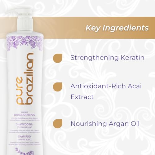 - Formulated with Keratin, Acai Extract, and Argan Oil: Enriched with a potent blend of strengthening keratin, antioxidant-rich acai extract, and deeply nourishing argan oil, Pure Brazilian - Always Blonde Shampoo elevates your hair care routine to a luxurious spa-like experience. This meticulously crafted formula not only cleanses but also pampers your hair, promoting resilience, shine, and unparalleled radiance, leaving your locks feeling soft, supple, and rejuvenated.