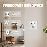 Premium Build for Durability: Our countdown timer switch for bathroom fan boasts a robust construction, this timer switch for lights featuring a quality plastic shell and high-conductivity copper inside material and keeps working for years. Programmable Countdown Timer: Take control of your electrical appliances with ease! This 120-minute countdown timer switch comes equipped with a programmable countdown timer, allowing you to set the working time of your appliances and automating the stoppage process. Precise Timer Setting: With the user-friendly knob, adjusting the timing range is a breeze. Set your desired time effortlessly and enjoy no hassle appliance management. Simply twist the timer’s knob to match your needs. Automated Convenience: Experience the convenience of automation! The digital in-wall timer switch allows your electrical appliances to work based on your pre-set time, ensures devices turn off after use, promoting safety and efficiency. Wall Mount Design: The timer light switch is wall mount design ensures easy installation in various locations. This twist timers is suitable for a wide range of electrical appliances such as fans, water heaters, pumps, routers, fish tanks, lamps, and more.