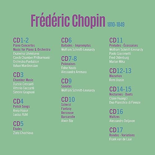 This year sees a refreshed Chopin Edition from Brilliant Classics; retaining many of the definitive recordings from it's predecessor of 2015 (94660) but boasting some exiting updates. The Concertos and piano concertante music are consolidated in a bright new cycle from Czechia; recorded last autumn by Siberian superstar Ekaterina Litvintseva and the KFPar under Mardirossian. Schmitt-Leonardy's sonatas are joined by No.1 - recorded late in 2015 and therefore just missing inclusion in the previous edition - bringing the complete cycle under his fingers. Alwin Bär's own Scherzi performances are reunited with his iconic 1998 recording of the Barcarolle; Fantasy and Berceuse. The Études are featured in a stunning complete cycle recorded in 2014 by the phenomenal Chopinist and 2023 OPUS KLASSIK double-nominee Zlata Chochieva. Finally the complete Nocturnes are given over to another noted young Chopin interpreter; the 2018 Geza Anda winner Claire Huangci; who recorded the set two years earlier; in 2016.