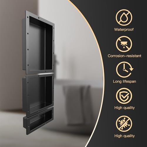 - 【Superior Water Resistance 】Our shower niche undergoes rigorous manufacturing processes to ensure its waterproofing performance. Each corner is sealed and reinforced to create a watertight barrier, effectively preventing moisture penetration and damage to your bathroom walls.