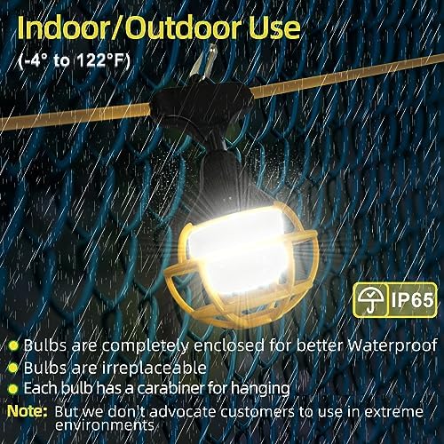 - [Heavy-duty & Daisy-chained Design]: The construction string lights with cages are built to withstand the rigor conditions on construction sites. This construction rope lights is IP65 waterproof, making them suitable for outdoor use. You can connect up to 3 sets of 50ft construction string lights, producing an impressive total of 24,000 Lumens through end-to-end connections, which can be extended to cover larger areas.