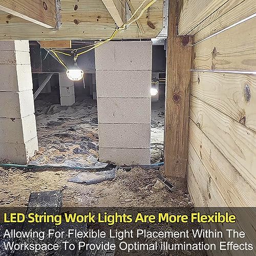 - [Wide Applicability]: The LED string work light is good for outdoor or indoor application, such as construction site, workshop, storage shed, warehouse, shipping container, crawl space, garage, attic, basement, backyard, campsite or anywhere need extra light.