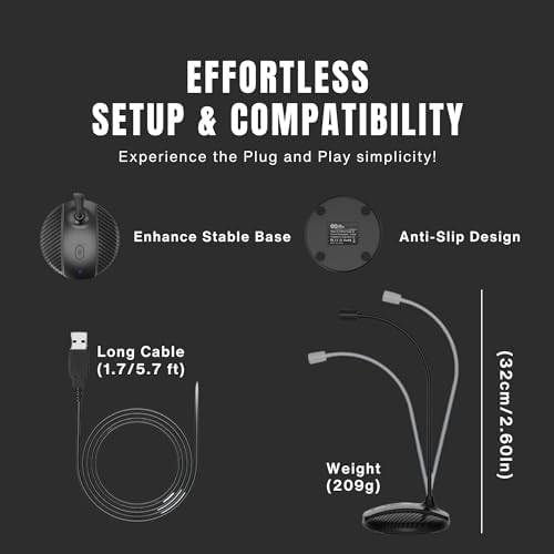 Gooseneck USB Microphone for PC - Plug & Play Computer Mic With Mute Button - Condenser Gaming Microphone - Omnidirectional USB