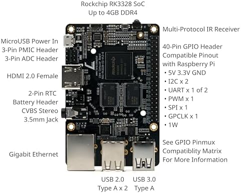 - HARDWARE EXTENSIBILITY: 40 Pin header enables hardware re-use by maintaining RPi compatible alternate pin functions like SPI, I2C, PWM, UART, and GPIO. Additional design features include ultra high speed (UHS) Micro SD card support, onboard IR, ADC header, eMMC module expansion connector, and more. Form-factor compatible for easy migration from Raspberry Pi 3 designs. See libretech-wiring-tool for more.