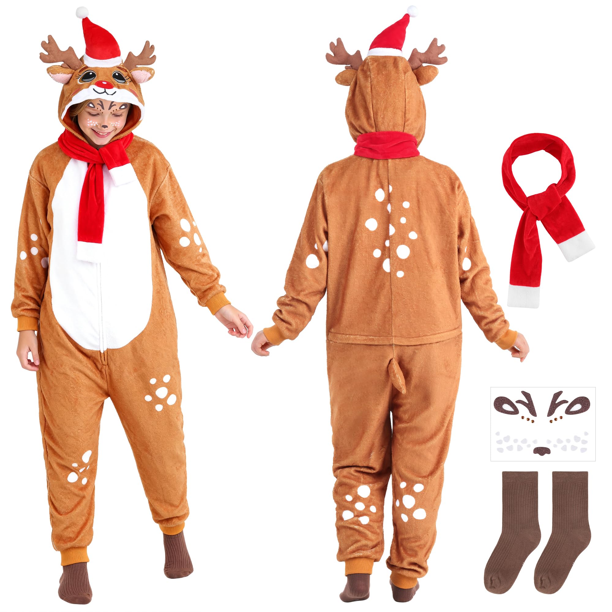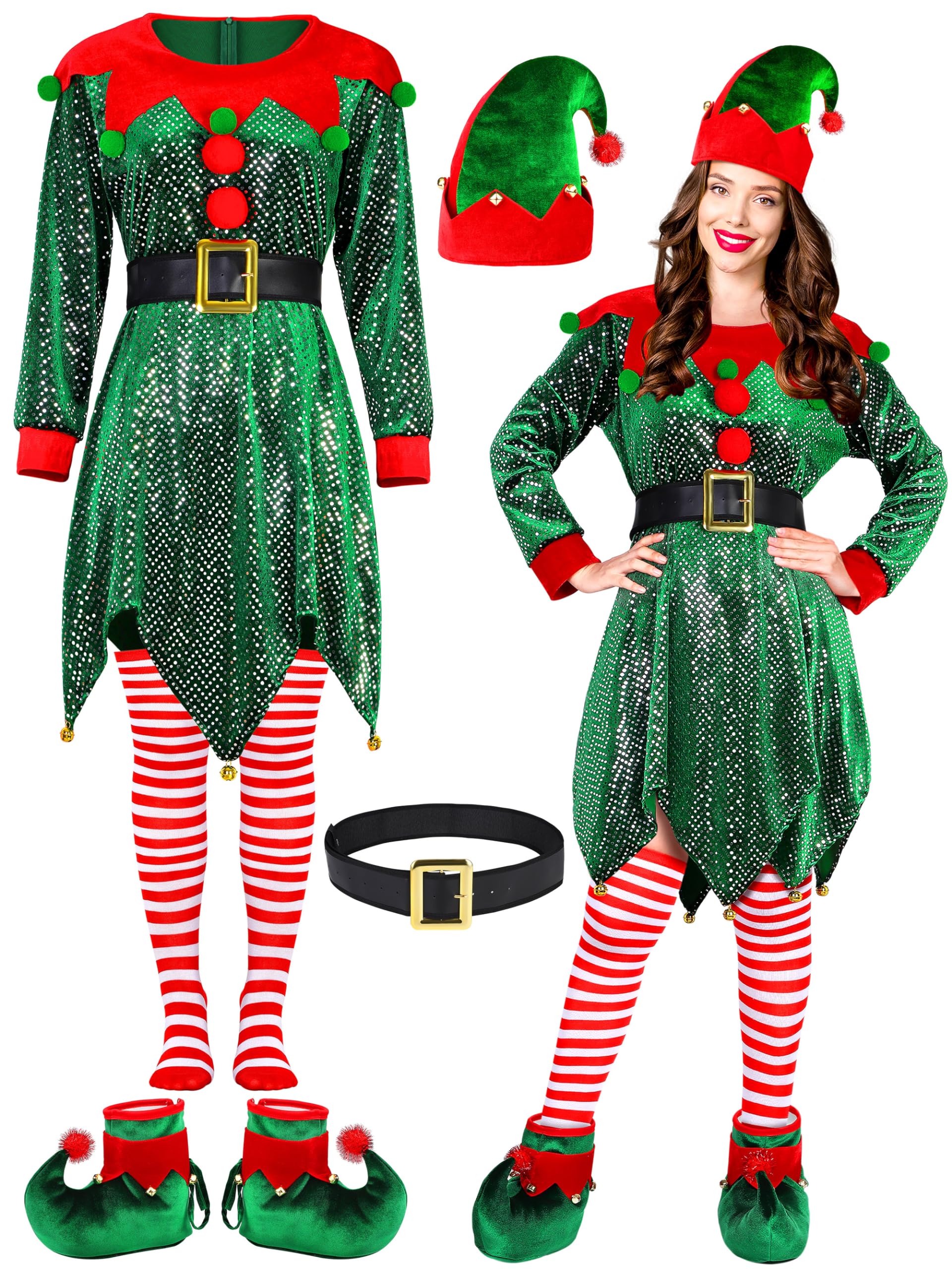 AOTHSO Girls Christmas Elf Dress Costume Set Elf Cosplay Outfit Velvet Dress Elf Hat Ear Belt Knee Socks for Christmas Party
