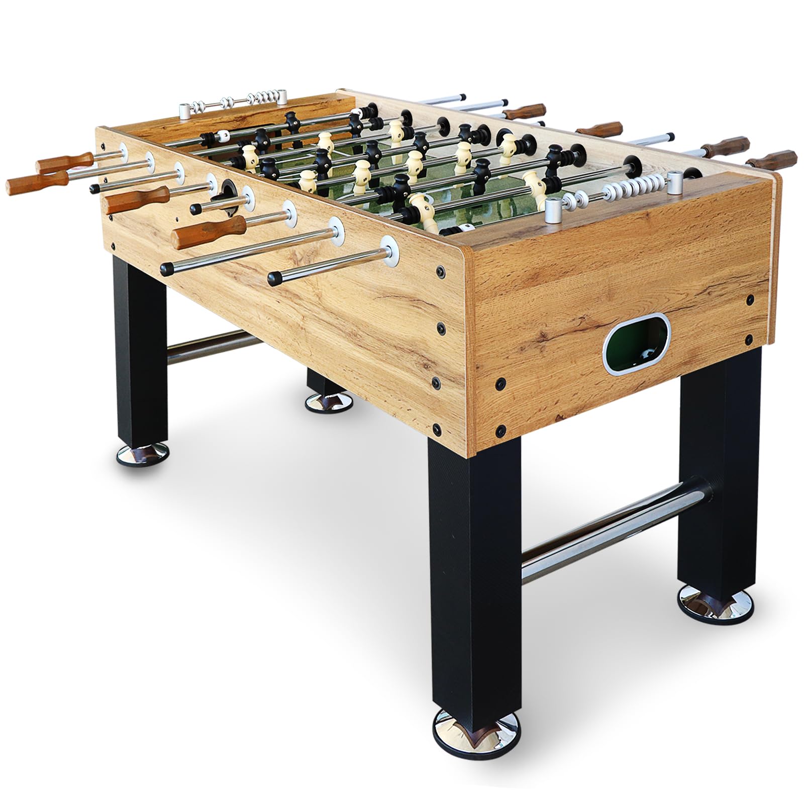 Bring the excitement of competitive foosball into your game room with this 55-inch competition-sized table. Featuring a sleek wood finish cabinet complemented by sturdy black legs, this table combines style with durability. The professional-grade playing field includes chrome-plated steel rods with comfortable wooden handles for smooth player control and precise shot execution. Built with stability in mind, the table stands on robust legs with adjustable levelers to ensure a perfectly even playing surface. The classic black and cream player configuration offers excellent visibility during fast-paced matches. Whether you're hosting friendly tournaments or practicing your skills, this full-sized foosball table delivers an authentic arcade experience. The solid construction and premium materials make it an excellent choice for both casual players and serious enthusiasts looking to improve their game.