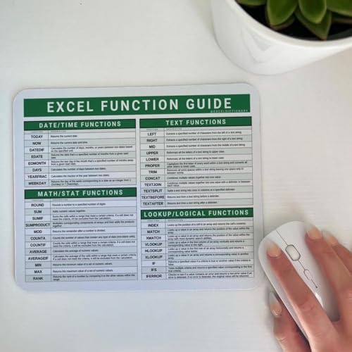 - MERICULOUSY DESIGNED: Over 40 Excel functions—right at your fingertips. Whether you're a spreadsheet novice or a seasoned pro, this mouse pad is your ticket to unleashing the full potential of Excel's powerful features and functions, all at your fingertips.