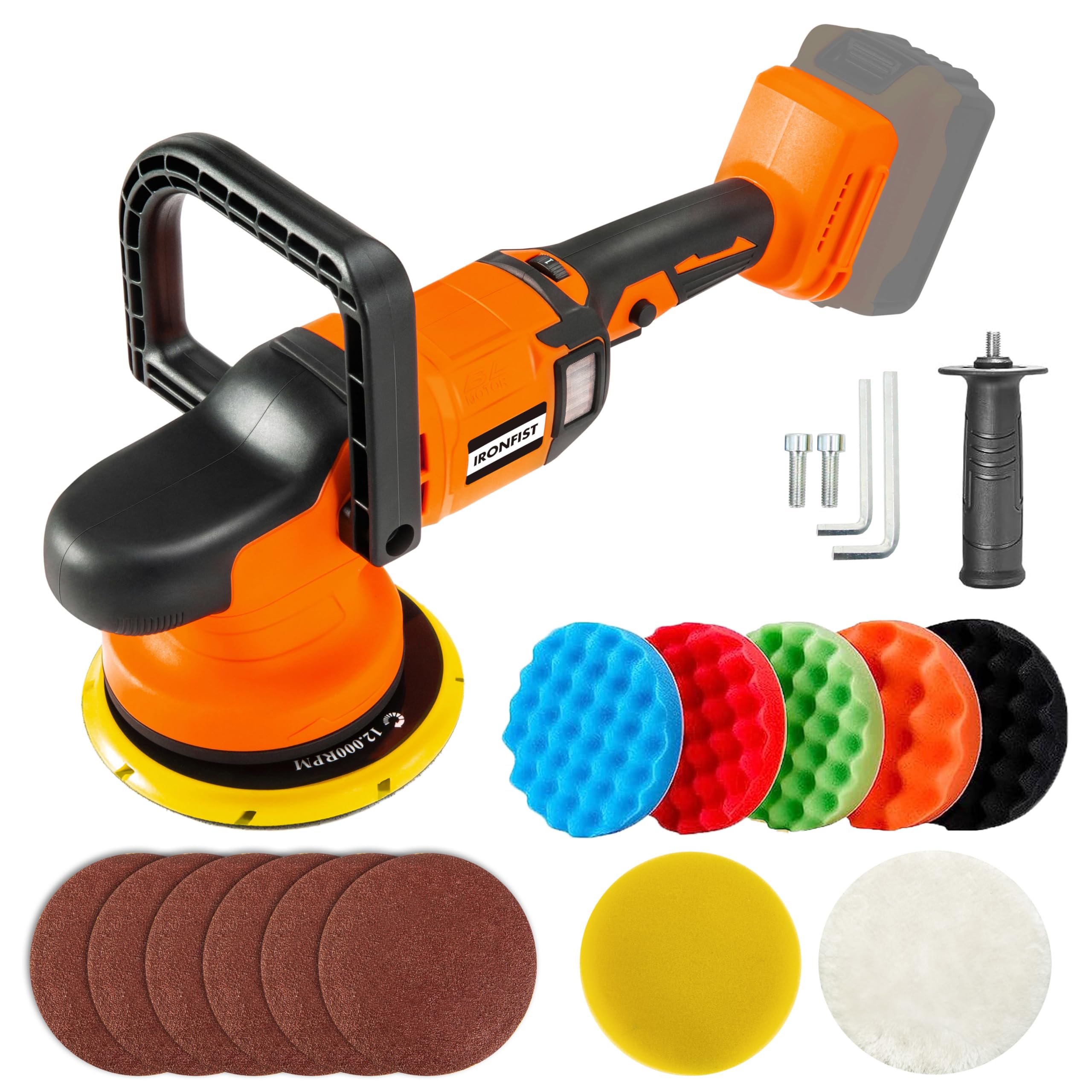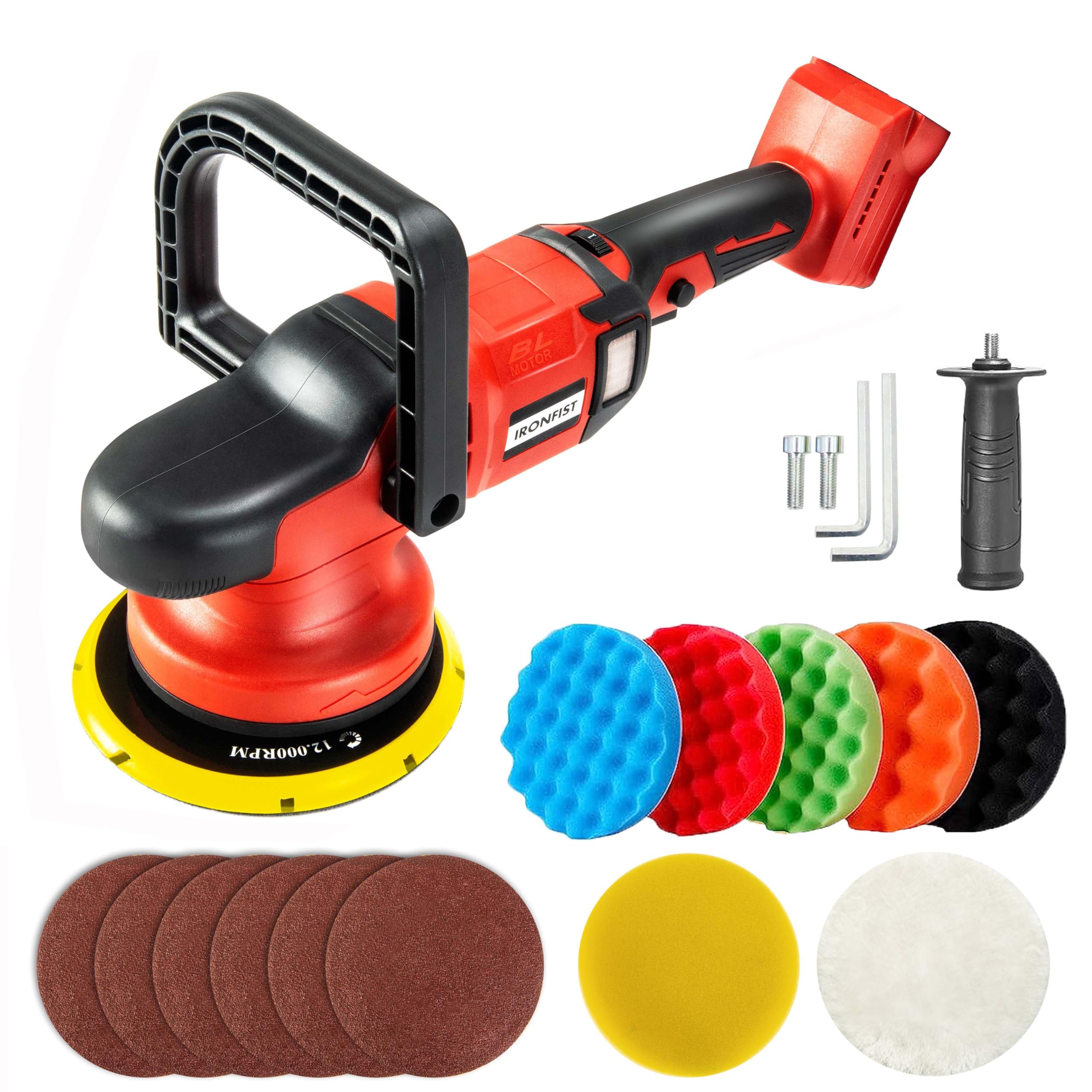 - PROFESSIONAL ACCESSORIES: 1 x D handle, 1 x Side handle, 6 x Sandpapers, 7 x Polishing Sponges, 2 x Hex Key, 1 x User Manual. It can be used for polishing, buffing and sanding for vehicles, cars, bikes, boats, kitchen, bathroom tiles, wood and more.