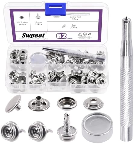 💥 Swpeet 122Pcs Canvas Snap Kit, Stainless Steel Marine Grade Canvas and Upholstery Boat Cover Snap Button Fastener Kit Including 3/8" Sockets 13mm Metal Screws Caps Anvil 3" Flaring Tool for Boat Cover 👑 Why Choose Us? 🏅 1.Diverse Choices ✨ In this kit, we provide you with many parts that can be attached to wood, plastic and fiberglass, etc. You can choose snaps and screws according to the thickness of the product or different application scenarios. 🏅 2. Easy to Carry ✨ The parts in this kit are sorted in a clear box, and they are lightweight and small enough to be portable. These parts have excellent rust resistance and are perfect for use in wood and wet environments. 🏅 3. Wide Application ✨ Stainless steel snap kits are suitable for indoor or outdoor use such as canvas, carpet, tarps, tent repair kits, awnings, canvas, lawn furniture, leather, fabric, boat accessories and more. 👑 Specifications: ✨ Material: Steel ✨ Color: Silver ✨ Size: ✨ Flaring tool: 3.3inches/84mm ✨ Anvil diameter: 0.94inches/24mm ✨ Screw base diameter: 0.4inches/10mm ✨ Cap diameter: 0.59inches/14.9mm ✨ Socket diameter: 0.51inches/13mm ✨ Stud diameter: 0.38inches/9.6mm ✨ Post diameter: 0.51inches/13mm ✨ Quantity: 122Pcs 👑 Package Includes: ✨ 40Pcs------- Sockets ✨ 40Pcs ------- Caps ✨ 40Pcs ------- 13mmScrews ✨ 1Pc ------- Anvil ✨ 1Pc ------- Flaring Tool ✨ In Total 122Pcs