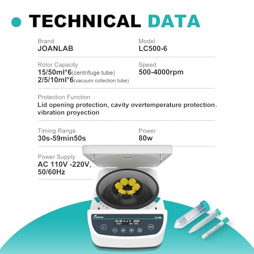 - JOANLAB laboratory centrifuge LC500 si with 500-4000 rpm,maximum relative centrifugal force 2146 xg,low-speed brake, fast and effective separation.Wide voltage technology, speed is not affected by voltage fluctuations. Timing range 30sec-99min.