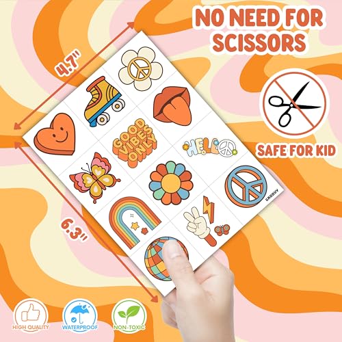 - 🌼【PERFECT PRE-CUT TATTOOS FOR THEMED GROOVY 70s DECORATIONS】: Groovy 70s pre-cut temporary tattoo stickers include 8 sheets in total, featuring 96 super cute and vibrant designs. These fun tattoos are perfect for party favors, holiday-themed small gifts, and decorations. Each sheet measures 16 x 12 cm (6.3 x 4.7 inches)-ideal for kids! Thanks to the pre-cut perforated lines, you can easily tear them apart by hand—no scissors needed!