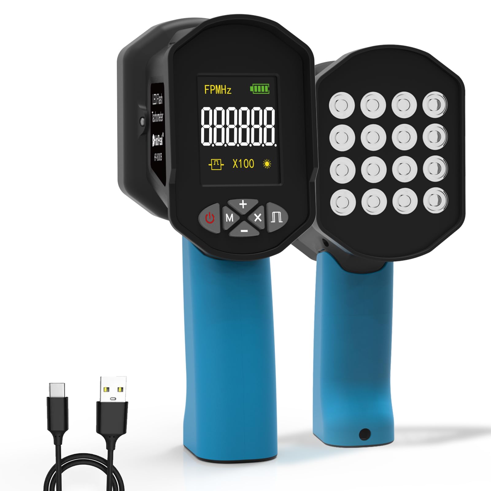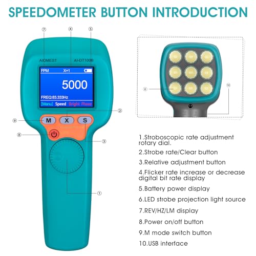 - 🎯【LED RPM Stroboscope】Unlike traditional laser tachometers that require sticking reflective tape, the AIMOEST AI-DT100B LED stroboscope measure rotating speed by emitting high-intensity LED flashes at precise intervals. This creates the illusion of slowing down or freezing fast-moving objects. When the flash frequency synchronizes with the object's motion, it enables accurate, non-contact speed measurement ranging from 60 to 999,999 RPM with 0.001% precision.
