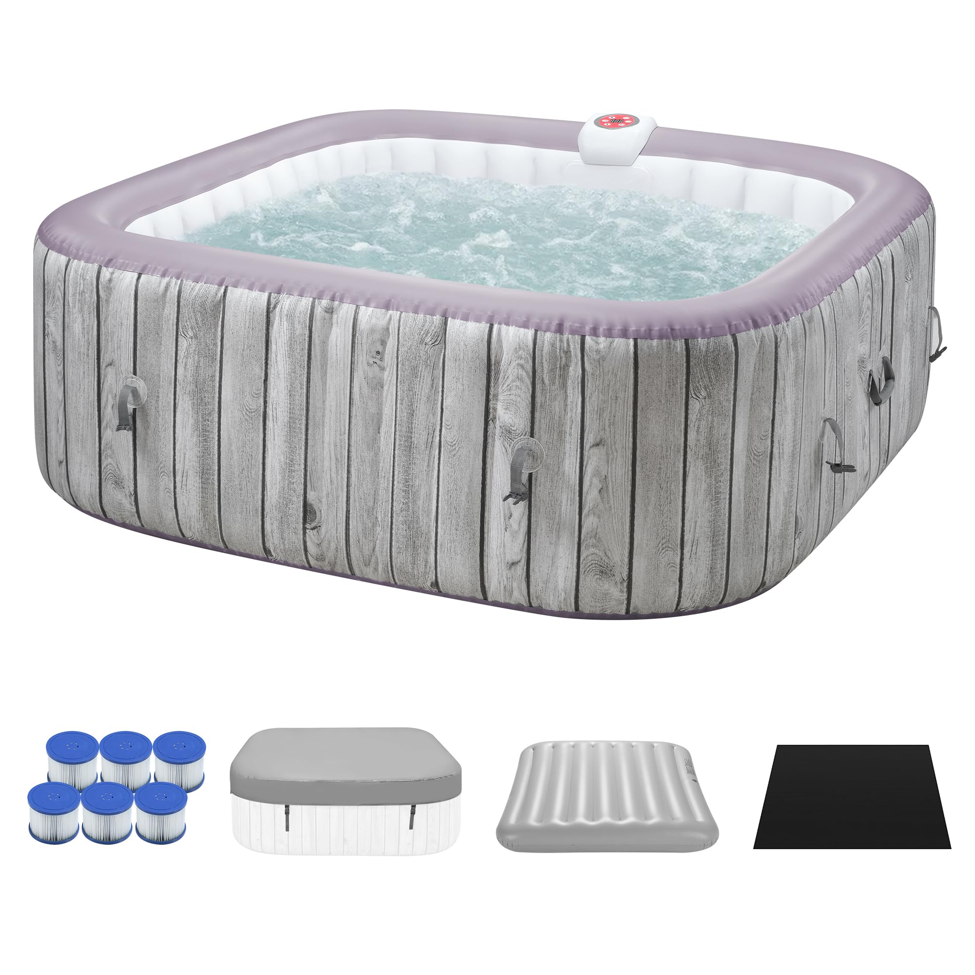- 【What You Get】1x inflatable Hot Tub, 2x Filter cartridges, 1x cover, 1x ground sheet, 2x air valve cap, 2x repair kit, 1x inflation hose, 1x drainage bung, 2x child safty key, 2x filter cover, 1x water inlet / outlet spanner, and instruction manual.