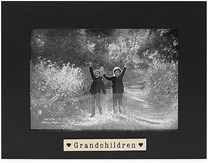 - BEAUTIFUL DESIGN: This high-quality frame is designed to spread warmth throughout any room. The wood frame has the look of distressed wood. The simple, yet timeless appeal of the distinct lines in the wood border helps give the classic frame an attractive appeal. The sentiment "Grandchildren" engraved into the bottom of the frame alongside two tiny hearts, draws all eyes to the wonder of your grandchildren in the photograph.