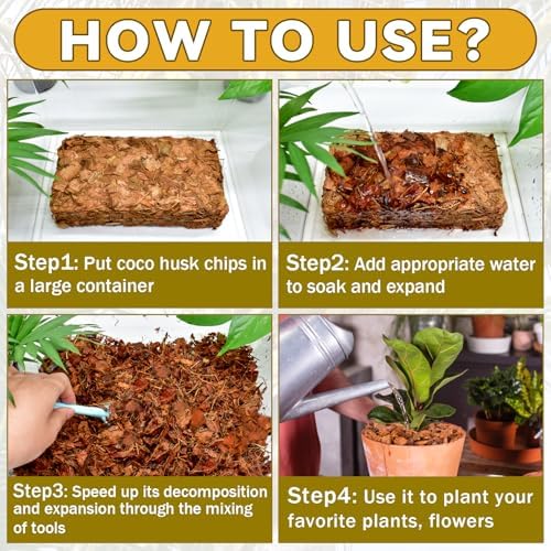 - 𝐂oco 𝐇usk 𝐂hips 𝐁rick for 𝐏lants: Crafted from compressed natural coconut husk chips, each lightweight 1.1 lb brick transforms into a generous 7 quarts of flaky, airy substrate when hydrated. Perfectly revitalizes garden soil or potting mix enhances aeration, drainage, and moisture retention for healthier root growth. Or, spread it as a beautiful, weed-suppressing mulch to elevate your landscape's natural beauty
