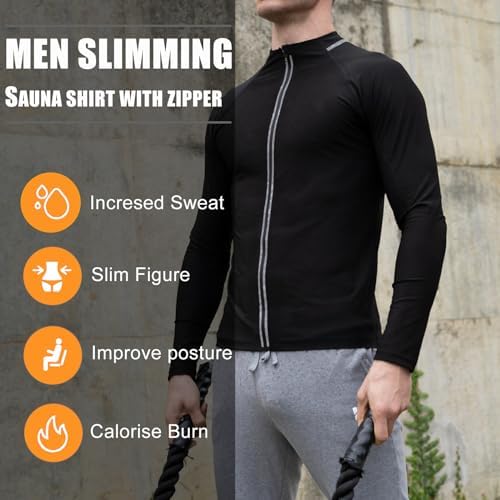 Sauna Suit for Men Sweat Jacket Long Sleeve Shirt Workout Body Shaper Zipper Top Slimming Fitness Trainer Gym Top-(S-3XL)