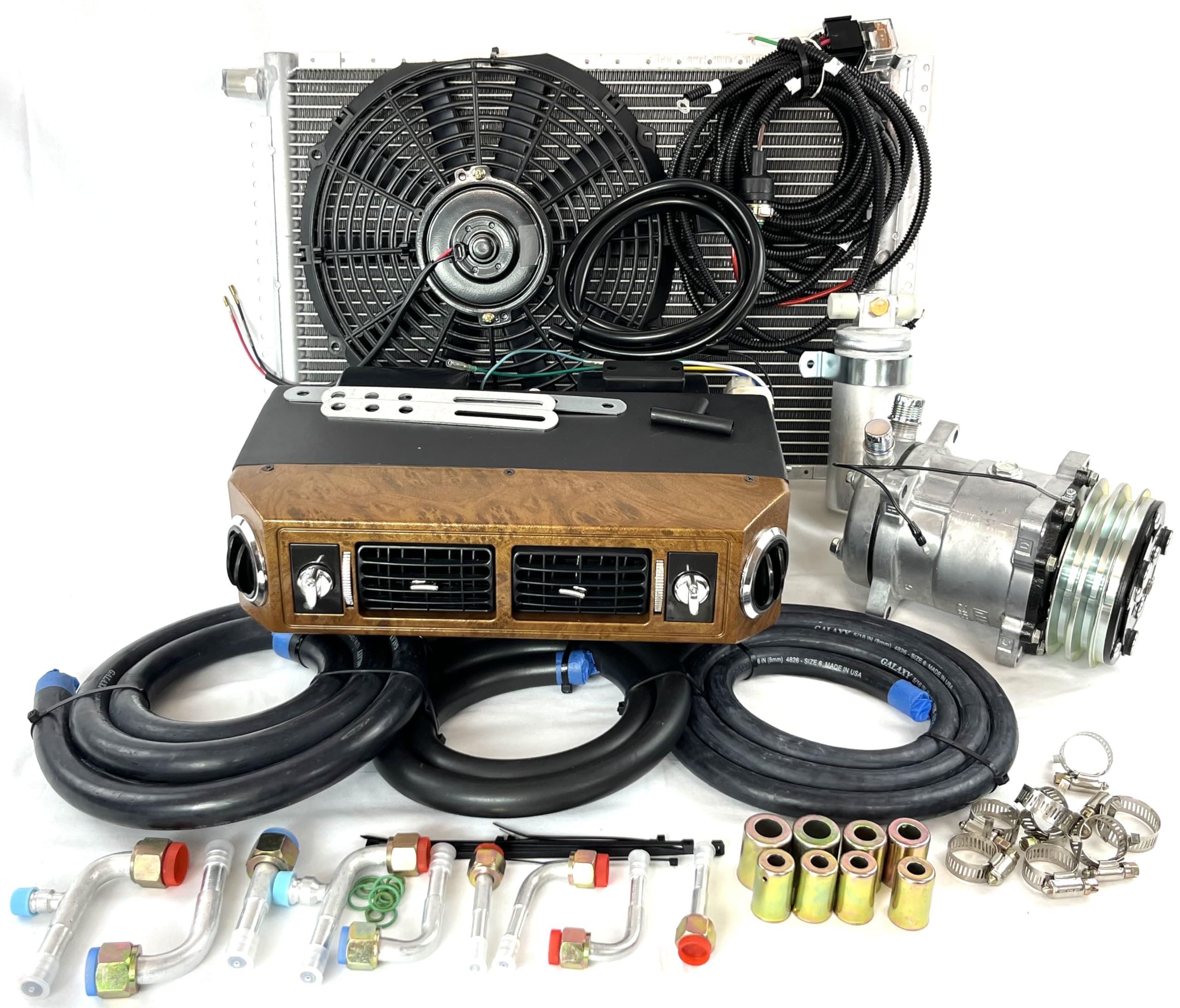 A/C KIT UNIVERSAL UNDERDASH APPLICATION: Small Cars, Classic Cars, Antique Cars, Truck Universal Under-Dash Evaporator Unit Model: E-432-0DCSL Cool Only Compressor Model: C5H142A12V SD508 5H14 Sanden Style 2A Groove Pulley 12v coil Also available 8PK Pulley Condenser Model: CPF121620 PARALLEL FLOW (micro-tube technology) Hoses Set Model: H6516,H81332, H1012 A/C HOSE #6 5/16 = 6'feet #8 13/32 = 4'feet #10 1/2 = 5' feet Fitting Set Model: FTSET404 1-N° 10 90° O-ring Fitting w/R134a Serv Port 1- N° 8 90° O-ring Fitting w/R134a Serv Port 1- N° 10 Straight O-ring Fitting 1- N° 10 90° O-ring Fitting 2- N° 6 90° O-ring Fitting 1- N° 8 90° O-ring Fitting 2- N° 6 Straight O-ring Fitting Set include metal FERRULES and CLAMPS If you decided use a/c clamps you don't need special crimper tool (YES... We include both systems) O-ring set is included Filter Drier Model: FD100A ALUMINUM Model: FD100B BLACK 2½"Diameter 7½"Hight Sight Glass #6 ⅜ X ⅜ O-ring connections both sides (HI/LOW BINARY PRESSURE SWITCH AND HARNESS CONNECTOR INCLUDED) (NOTE: Aluminum or Black) if you have a preference let us know leaving a message Condenser Fan Model: CF1212 12" Diameter 12 Volts 80W 6 AMP Reversible Puller or Pusher 4 Mounting Brackets included Electrical Harness all ours kits come with “Plug and Play” Electrical harness to easily connect all the components designed for a regular size car or trucks applications. for special Lengths applications please contact us extra charges maybe apply We includes full DIY installation guidelines, also we can provide you a technical support over the phone or via email