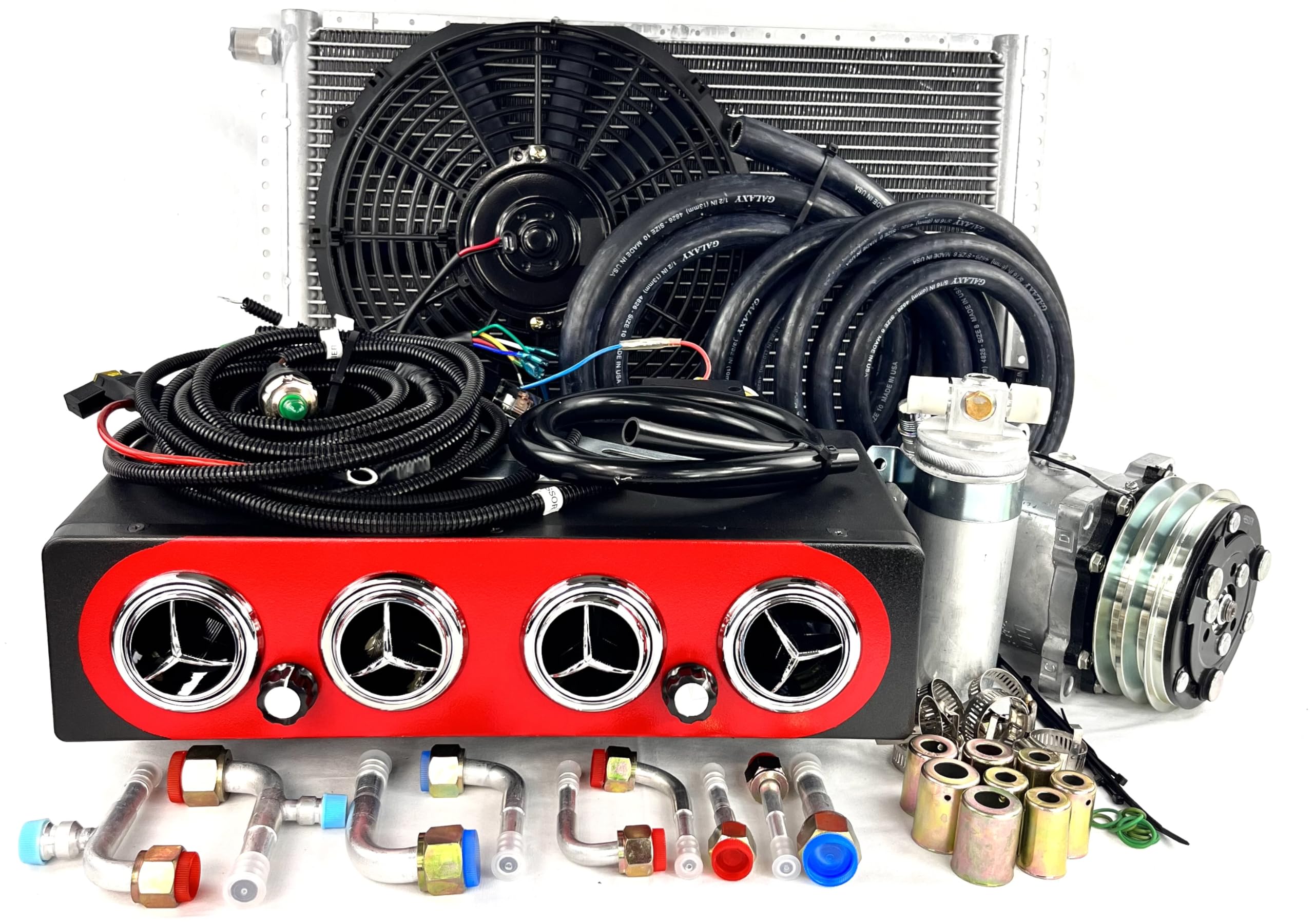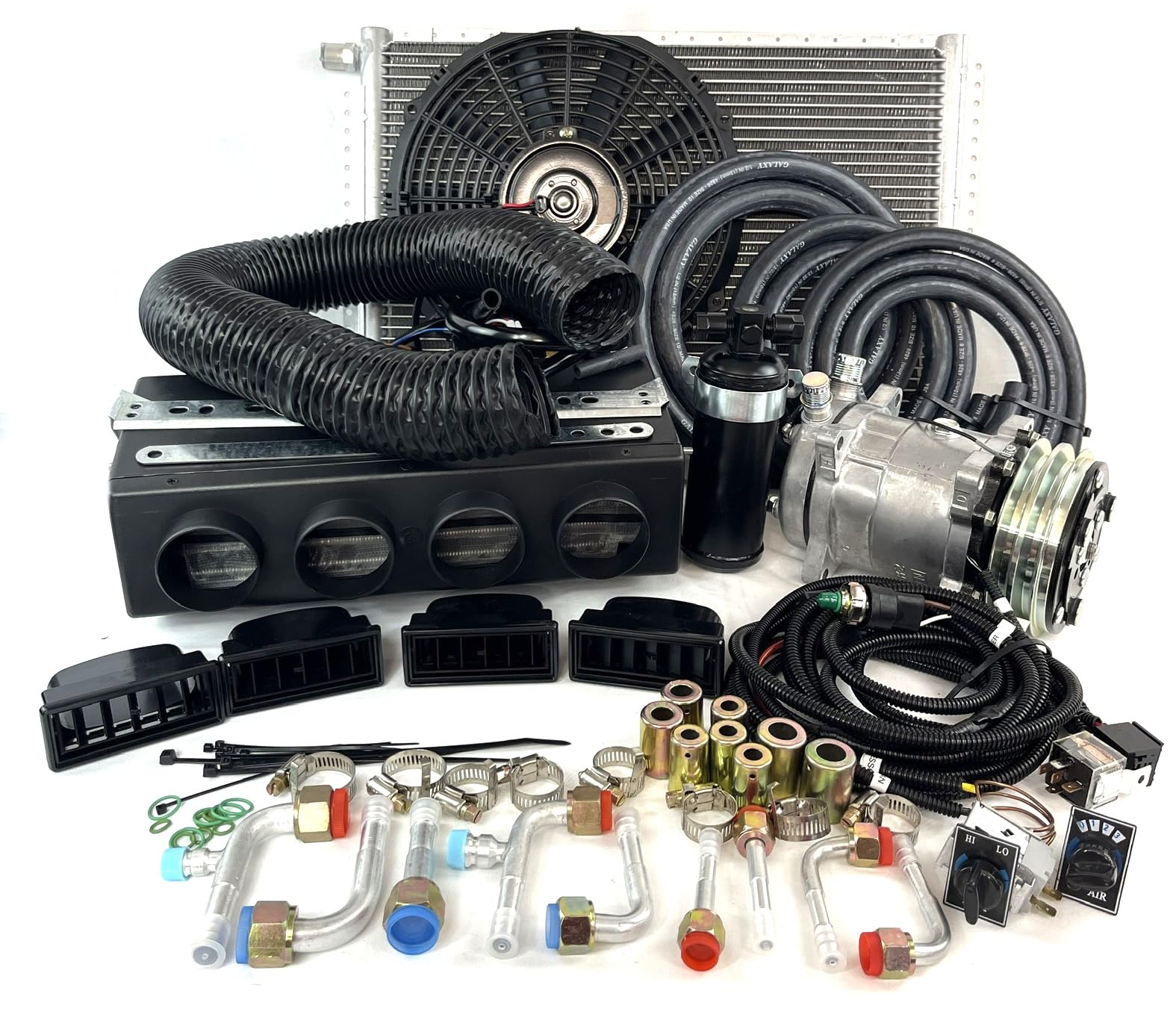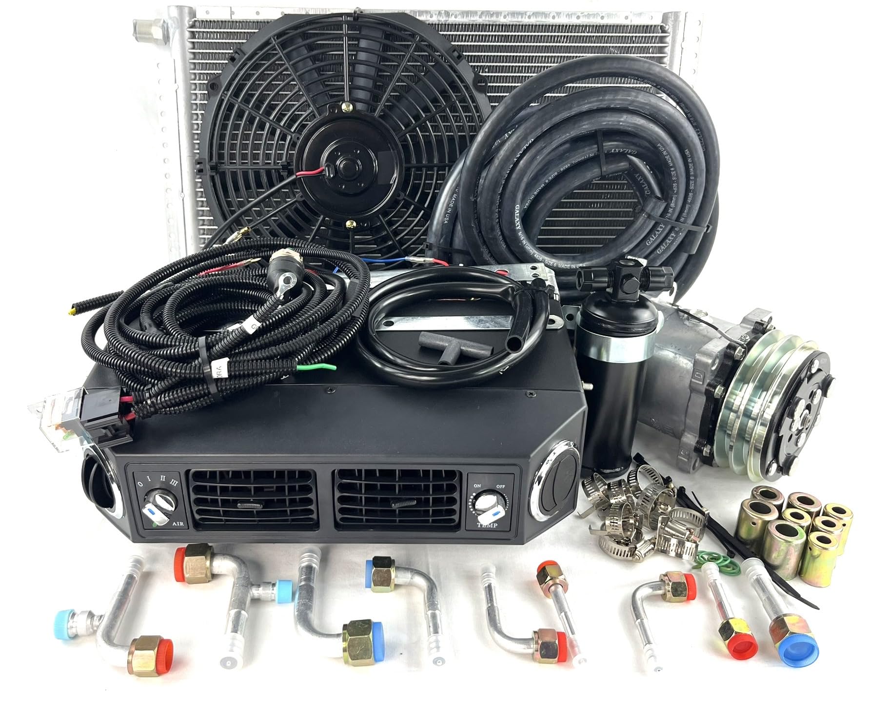 Universal Under-Dash Evaporator Unit Model: E-432-100 NEW MODEL 2023 Cool Only 32 pass 4way all aluminum coil Expansion valve 1.5 Ton Thermostat and rotative 3-speed blower switch 12 VOLTS DOUBLE SHALF BLOWER MOTOR Mounting bracket drain hose and T included 12,700BTU capacity 359 CFM DIMENSIONS: L14½" X D12½" X H6" Compressor Model: C5H142A12V SD508 5H14 Sanden Style 2A Groove Pulley 12v coil Also available 8PK Pulley Condenser Model: CPF141620 PARALLEL FLOW (micro-tube technology) 14"H X 16"L .70"(20mm Core Depth)W 4 Rails Aluminum #8 O-ring IN #6 O-ring OUT Hoses Set Model: H6516,H81332, H1012 A/C HOSE #6 5/16 = 6'feet #8 13/32 = 4'feet #10 1/2 = 5' feet (NOTE: if you need extra hose JUST LET US KNOW, extra charges maybe apply) Fitting Set Model: FTSET404 1-N° 10 90° O-ring Fitting w/R134a Serv Port 1- N° 8 90° O-ring Fitting w/R134a Serv Port 1- N° 10 Straight O-ring Fitting 1- N° 10 90° O-ring Fitting 2- N° 6 90° O-ring Fitting 1- N° 8 90° O-ring Fitting 2- N° 6 Straight O-ring Fitting Set include metal FERRULES and CLAMPS If you decided use a/c clamps you don't need special crimper tool (YES... We include both systems) O-ring set is included Filter Drier Model: FD100A ALUMINUM Model: FD100B BLACK 2½"Diameter 7½"Hight Sight Glass #6 ⅜ X ⅜ O-ring connections both sides (HI/LOW BINARY PRESSURE SWITCH AND HARNESS CONNECTOR INCLUDED) (NOTE: Aluminum or Black) if you have a preference let us know leaving a message Condenser Fan Model: CF1212 12" Diameter 12 Volts 80W 6 AMP Reversible Puller or Pusher 4 Mounting Brackets included Electrical Harness all ours kits come with “Plug and Play” Electrical harness to easily connect all the components designed for a regular size car or trucks applications. for special Lengths applications please contact us extra charges maybe apply We includes full DIY installation guidelines, also we can provide you a technical support over the phone or via email