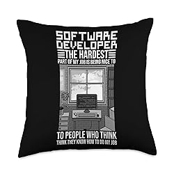 100% Polyester The Software Developer design is for computer science professional or software developer who loves using AI and IT tools. You love working as a computer scientist and software developer? Then you'll love this too! Software Developer the hardest part of my job is being nice to people who think they know how to do my job 100% spun-polyester fabric Double-sided print Filled with 100% polyester and sewn closed Individually cut and sewn by hand Spot clean/dry clean only