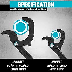 Reliable Quality: High quality steel adopts drop forged process. Heat treated for high hardness. Black sprayed surface ensures effective rust-resistant performance, allowing for frequent use Self Locking Function: Self-adjusting head design enables one-handed operation and easy use. This multi-functional pipe wrench set offers sufficient flexibility for a wide range of repair work. Even novice users can easily operate it Anti-slip Tooth: The 3-sided teeth design ensures a tight bite that securely locks onto nuts, pipes, and round tubes of different sizes, can greatly enhances fastening and unscrewing job efficiency Comfortable Handle with Crowbar Design: Rubberized handle provides sufficient torque and anti-slip grips, while the crowbar design in the tail allows for easy handling of prying jobs, solving various problems Wide Application: With the jaw capacity from 14 mm to 30 mm for the smaller wrench and 30 mm to 60 mm for the larger one. It is an indispensable professional partner in your toolbox