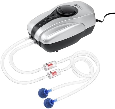 - PERFORMANCE – This aquarium air pump is energy efficient with powerful air output. Power 4Watt, Flow rate 120GPH, Air Pressure ≥0.02MPa. This air bubbler comes with 2 air outlets and fits fish tank size of 20-80 gallons.