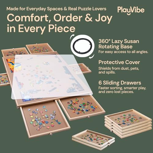 - Leading Puzzle Table With Storage: The PlayVibe jigsaw puzzle board with cover is expertly designed for assembling and storing 1500-piece puzzles. With six drawers for puzzle organizers and storage, it makes transporting and displaying your masterpiece a breeze