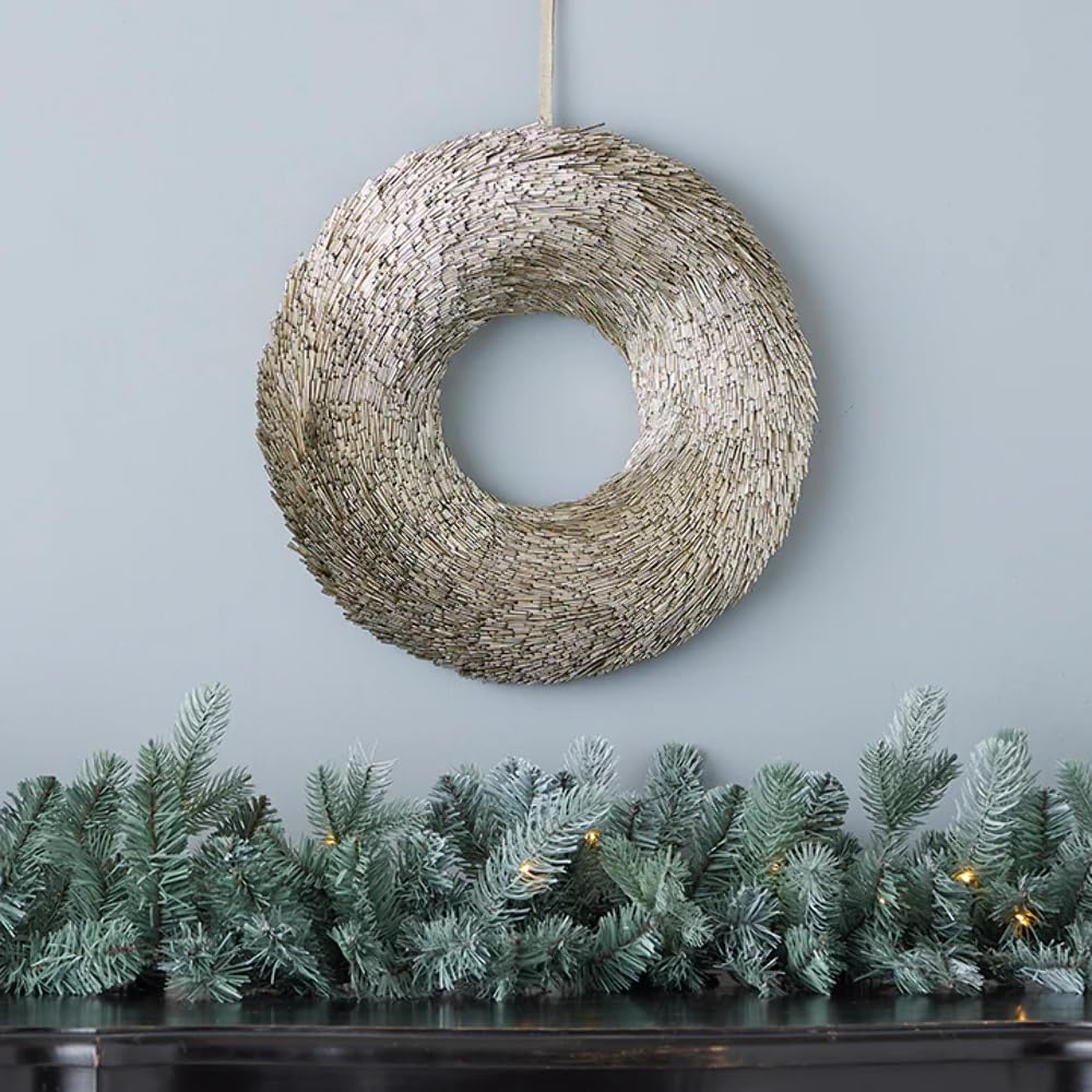 - This holiday decoration features three glittered white giftboxes each wrapped with a gold ribbon and bow and topped with evergreen tips and red berries.