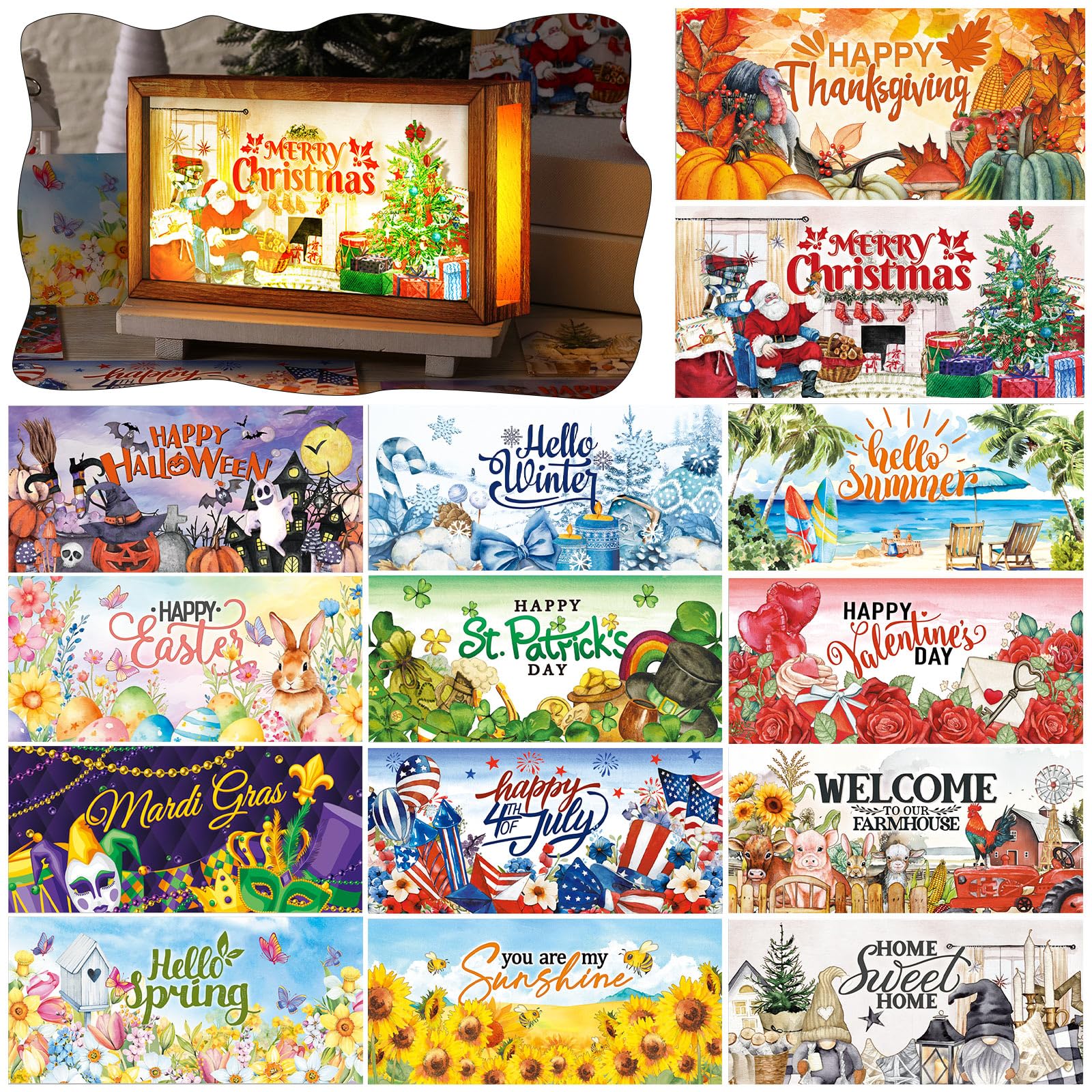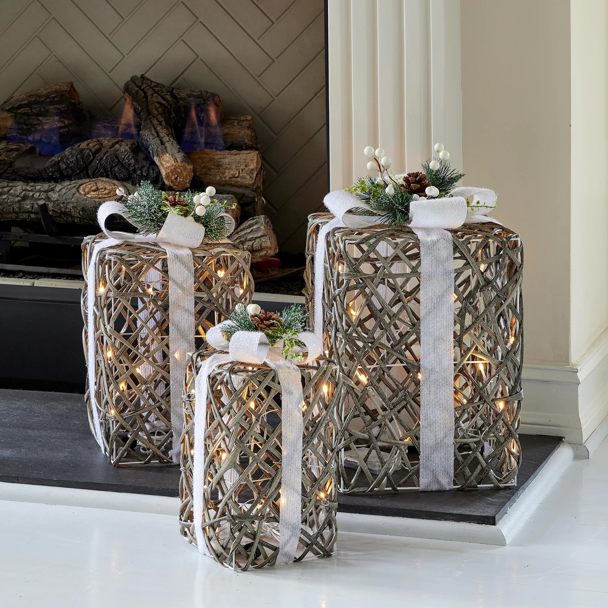 - Three-piece assortment Box heights measure 12", 10" and 8" Pre-lit with 45 total battery operated warm white LED lights Wire structures wrapped in fabric shell LED lights are energy-efficient and long lasting For indoor or outdoor display Requires 9 AA size batteries (not included)