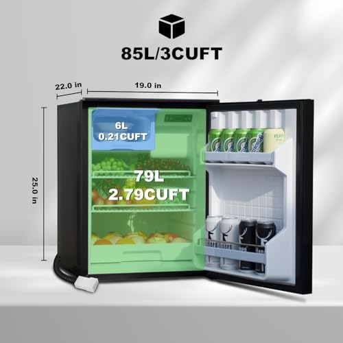 - 12v/24v Dual Way Fridge: The DC RV refrigerator can support both 12V and 24V voltages, current range: 4.3A-2.1A; temporary use as a solar-powered backup refrigerator is fine, and the mini refrigerator is designed for quiet operation, only 36db that won't disturb your quiet sleep inside the caravan. DC refrigerators are known to be very safe that do not leak and are environmentally well