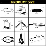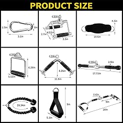 💪【Lat Pulldown Attachments Set】: Includes:1xGrip Lat Pull Down Bar, 1x Tricep Rope, 1x V-Handle (Double D Handle), 1x V-Shaped Bar, 1x Straight Rotating Bar, 2x Single D Handle, 2x Cable Machine Handle, 2x Ankle Straps, and 8x Snap Hooks . These home gym accessories for men and women are designed to fit most cable systems. 💪【With Grip Lat Pull Down Bar】:Our rubber handle with efficient D Grip design on both sides has a balanced curvature that creates feeling of solid grip, prevent slipping during workout even with sweaty hands.It can better exercise your grip, shoulders, and back. 💪【TOP PROCESS & MATERIALS 】- Cable machine attachment constructed of high-quality solid steel with polished chrome finish. 0.6 inch hole can fit easily for all cable system. Textured rubber coating handle,provides ergonomic & secured grip during workout, provides a balanced force to both arms when attach it to any gym machine. 💪【MULTI WORKOUTS】-Tricep pull down attachment perfect for building stronger triceps and grip strength, assisting muscles around elbows, wrists, back, abs and shoulders with different compound pushing exercises: triceps pushdowns, seated cable rows, straight bar cable pressdown, seated upright rows, perfect for both workout at home and gym. 💪【ALL LEVEL APPLIED】: LAT Pull Down Attachment can be used for all gym levels, from beginner to professional,this exercise equipment will help you focus on the target muscle groups rather than putting unnecessary stress on the joints.If any questions, our order support the all-the-way tracking service on amazon. We guarantee fast customer service and only wish our customers satisfaction.