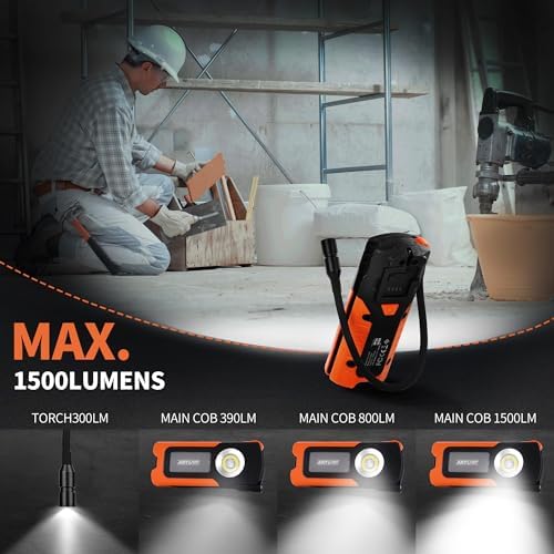 - 【GOOD BRIGHTNESS AND 4 LIGHTING MODES】 This 15W 1500 Lumen COB+300LM Gooseneck LED Work Light offers excellent brightness and comes with 4 modes to meet your various needs: 1500LM High Brightness, 800LM Normal Brightness, 390LM Low Brightness, and 300LM Gooseneck. It can be used continuously for 3 hours in high brightness mode, approximately 6 hours in normal brightness mode, and 12 hours in low brightness mode. The gooseneck light can be used alone for up to 16 hours on a full charge.