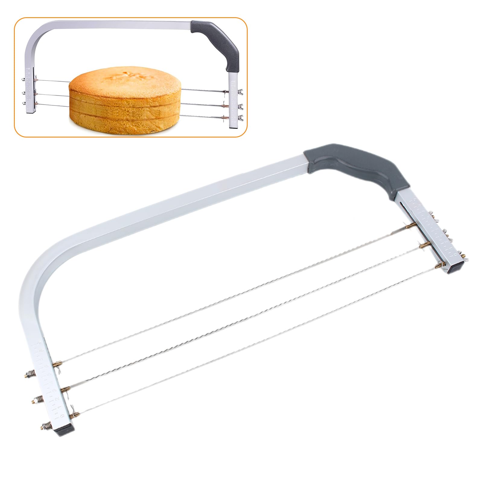 - CUTTING LINE HEIGHT ADJUSTABLE: The cutting line height of this pastry cutter tool is designed to be adjustable. We have fully considered the height of different cakes when making this product, and the adjustable height of the cutting line is suitable for most cakes. And with a graduated adjustable blade that measures from 1cm to 9cm, with 3 adjustable wire cutting saws for clean cuts at any desired depth.
