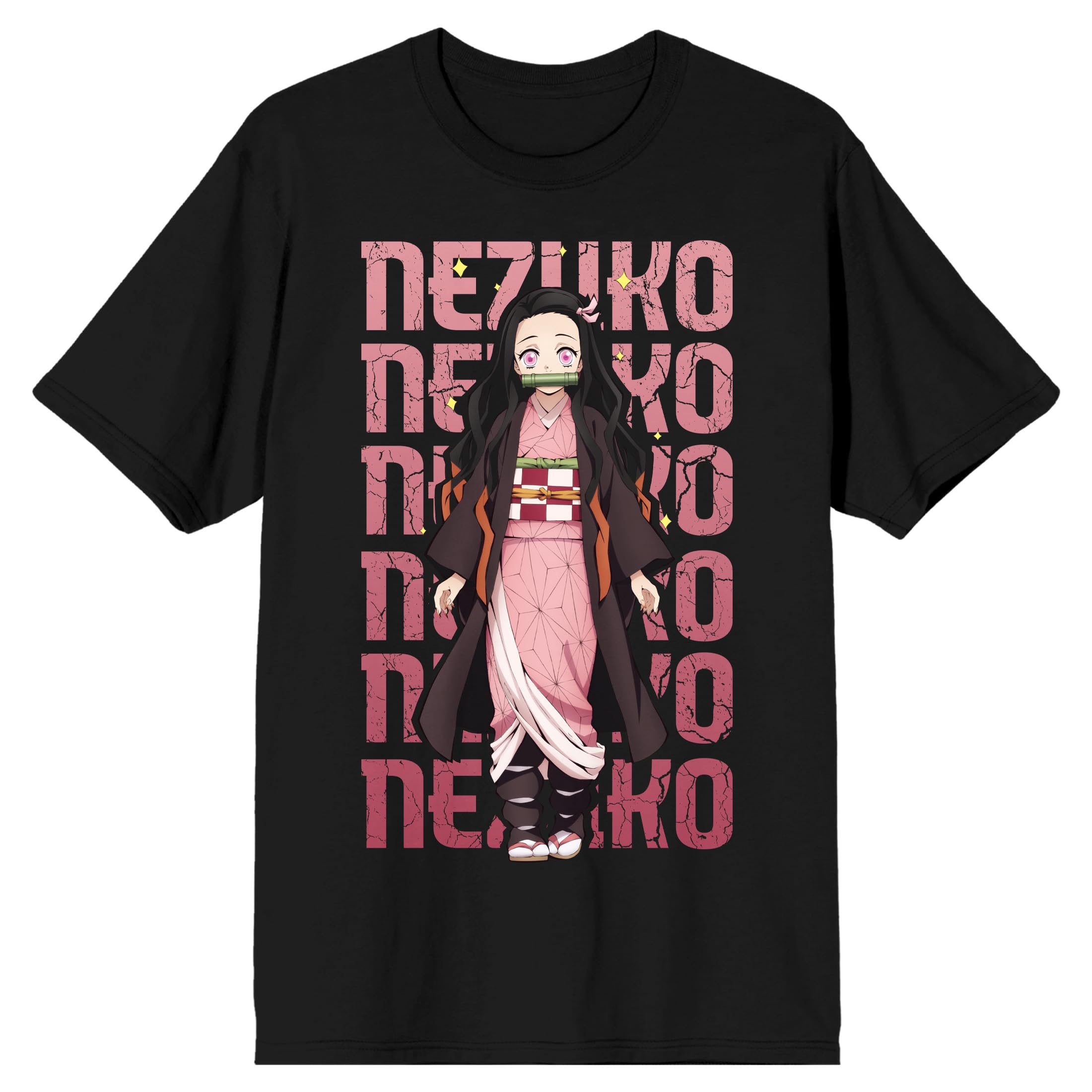 Elevate your style with this men's black Demon Slayer crew neck short sleeve t-shirt. The shirt showcases an engaging image of Nezuko standing before a vibrant pink wall of repeating text that bears her name. Crafted from comfortable cotton, this t-shirt can be easily cared for with machine washing on cold and tumble drying on low heat.