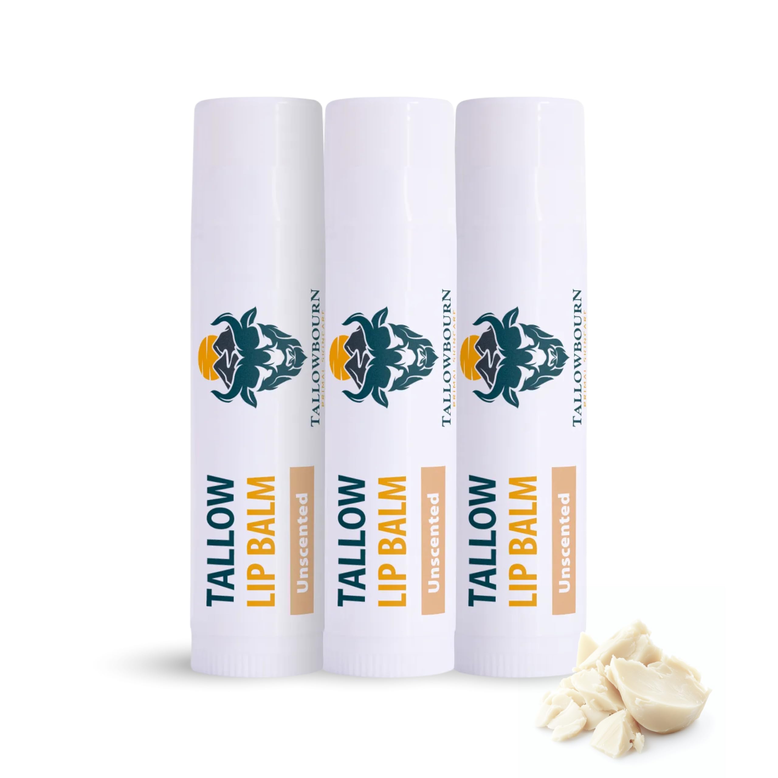 Moisturizing Tallow Lip Balm – Grass-Fed Beef Tallow with Organic Coconut Oil, Beeswax, and Vitamin E – Unscented Lip Balm Set – Travel Essential - 3-Pack