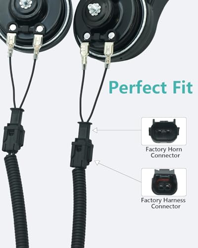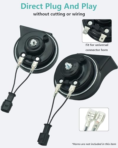 - Installation: Insert one end into the universal connector horn, and the other end into the factory horn's female connector, plug and play