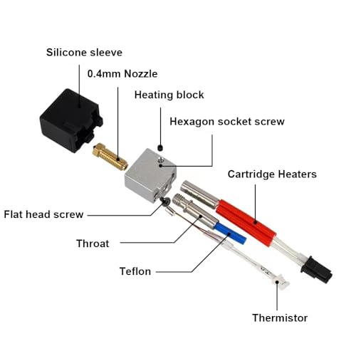 - Package Included: 2PCS silicone cover + 1PC Hardened Nozzle + 1PC Brass Nozzle + 1 set hotend kit (heater cartridge, thermistor, heat block,throat tube, nozzle)