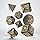 - The set contains 7 polyhedral dice and a metal coin.