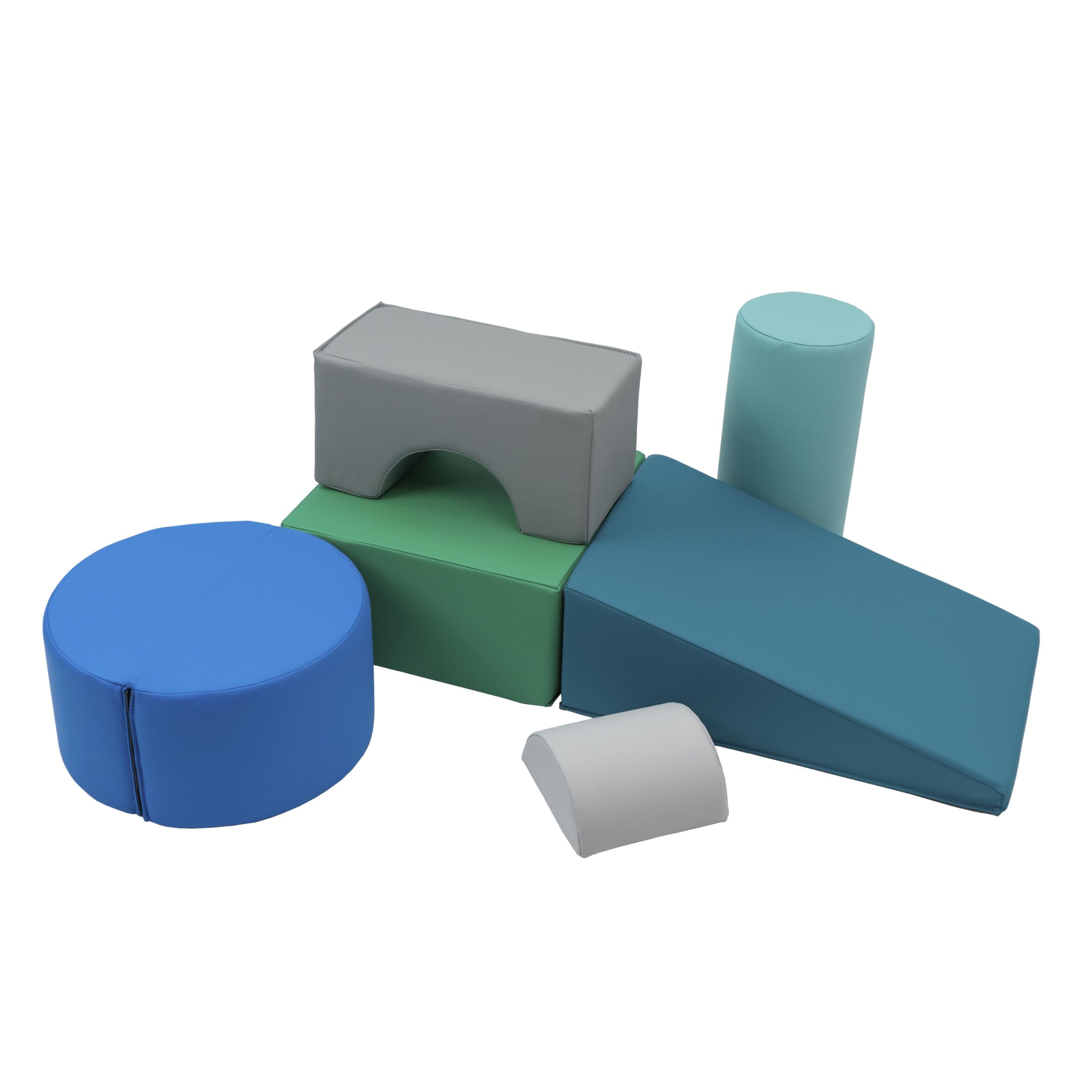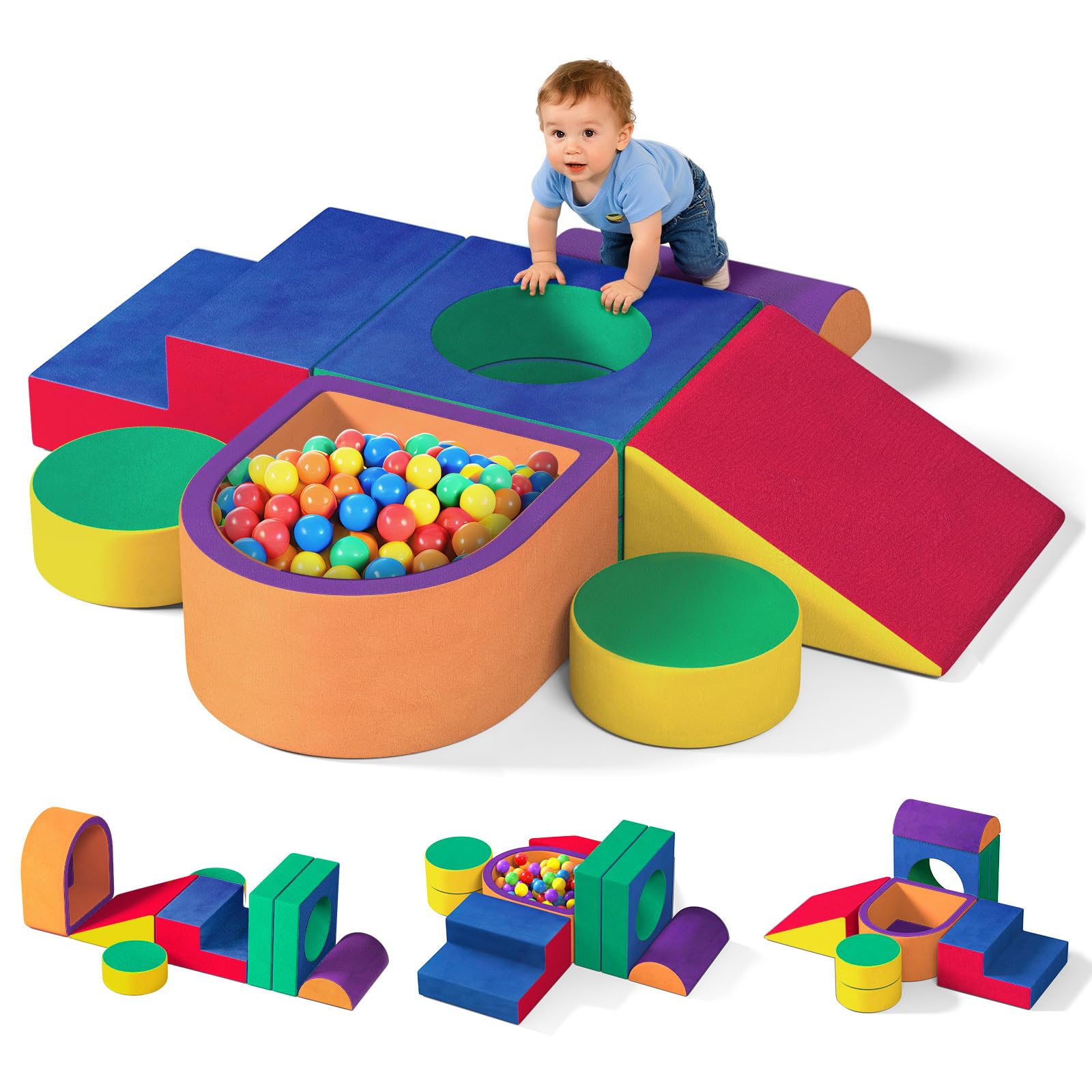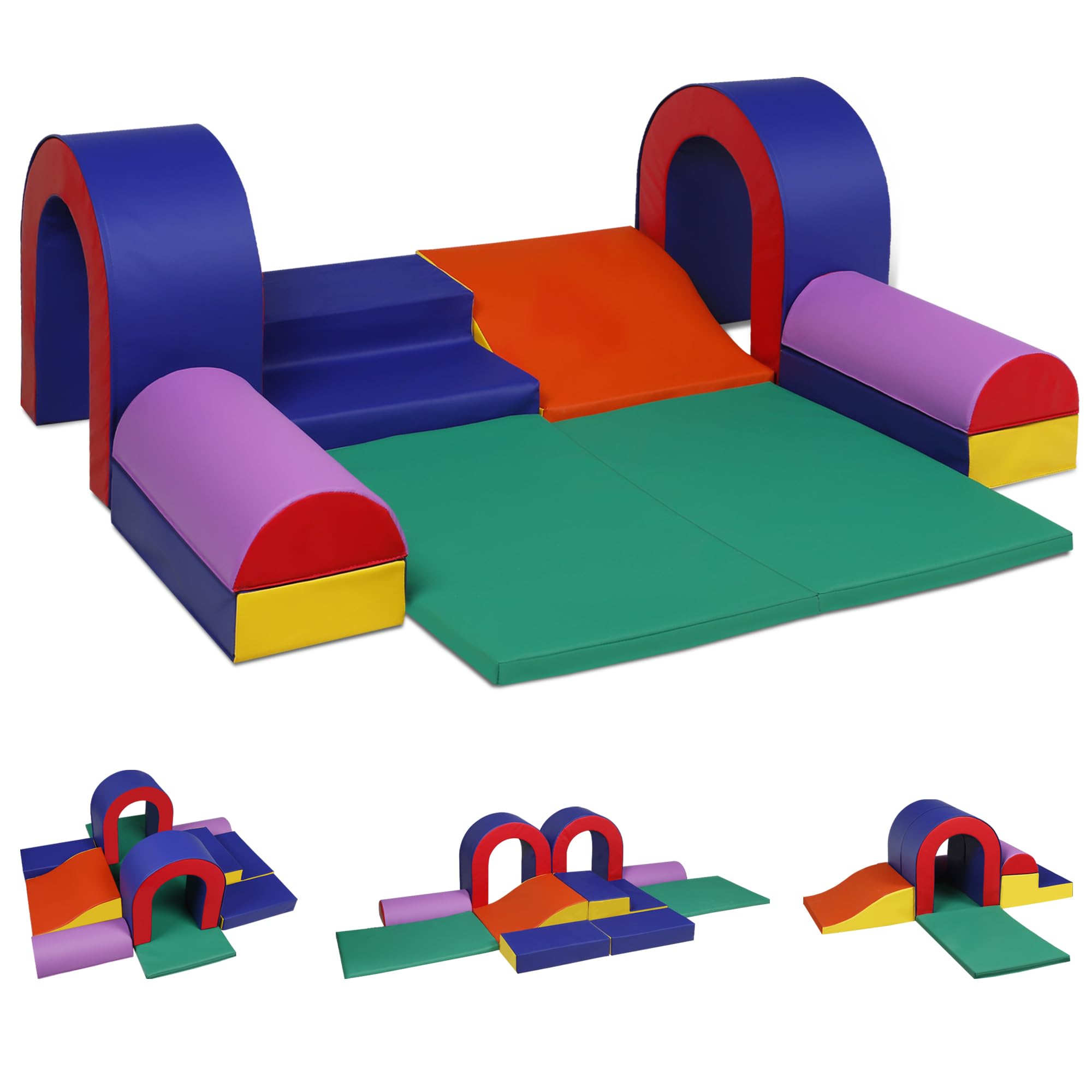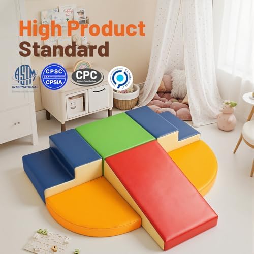 - 6-Piece Set: Baby climbing blocks consists of 2 blue stairs, 2 orange half-moons, 1 green square and 1 red slide. This soft play equipment stimulates your child's imagination to create endless combinations of structures, allowing them to enjoy the fun of the toy as they climb up and down, stacking and swapping four different shapes. Our climbing sets have a unique patented design that your child is sure to love