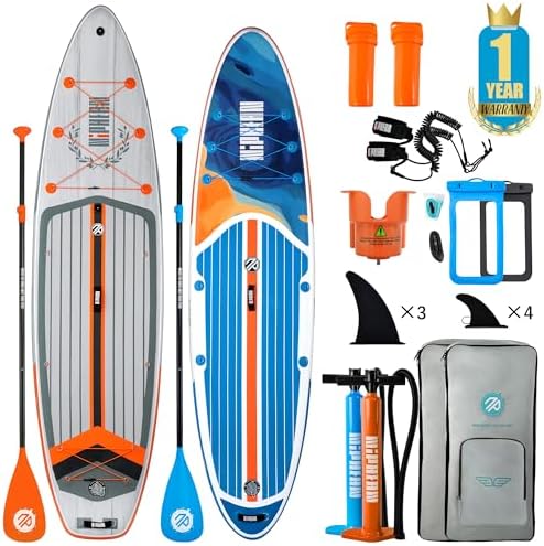 Niphean inflatable paddle board combine exceptional quality, stability, and versatility for water sports enthusiasts of all levels. Measuring 10'6" x 33" x 6" or 11' x 33" x 6", and weighing just 19 lbs with a capacity of over 400 lbs, they are perfect for adults and pets alike. Each paddleboard comes equipped with a full set of accessories, including an adjustable paddle, detachable fins, a safety leash, a pump, a SUP backpack, a waterproof phone bag, a repair kit, and more, ensuring you're ready to hit the water right away. Niphean sup feature a textured EVA deck for superior slip resistance and comfort, while the larger, detachable balanced fin enhances stability, making it easier for even beginners to paddle confidently. With 11 or 15 D-rings, the paddle boards offer extra functionality, such as attaching a kayak seat, securing a cooler, or connecting with other stand up paddle board. Whether in the ocean, lake, or river, the board is versatile enough for yoga, surfing, exploring, traveling, and fishing. Additionally, Niphean provides outstanding customer service, with a 30-day return policy and a 1-year warranty, ensuring your complete satisfaction.