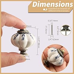 *Purchase Guiding* 12 x Hand Painted Ceramic Pumpkin Knobs with mounting set. Pattern: Blue Willow Leaf. Knob size: 1-3/8" x 1-1/2"(Dia.* L). Mounting hole depth is 0.2" / 5mm. 12 x Regular Screws 1" / 25mm. *Vintage Appearance* Elegant appearance, antique design and exquisite craftsmanship make it not only beautiful and stylish when collocated with modern furniture, but also add a classic charm to your home. *Durable Quality* The drawer knob is made of ceramic, which is sturdy, durable, and easy to maintain. It is an economical and practical home decoration, and easy installation is a good choice for DIY projects. *Wide Applicability* The pumpkin shape and simple design is suitable for many kinds of furniture such as kitchen cabinets, drawers, cabinets, doors, drawers, wardrobes, home dressers, offices and many other uses. *Comfortable Purchase* If you have any questions about our products, please contact us by email in Amazon, in order to provide our customers with a comfortable purchasing experience, we will reply you within 24 hours.