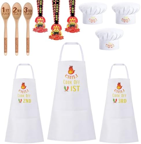 - Auspicious Awards for Fiery Creations: our chili cook off prizes are designed to cater to your cooking competition needs; The package includes 12 quality pieces including 3 chili cook off medals, 3 cooking aprons, 3 chef hats, and 3 engraved spoons, providing ample rewards to spur on the fiery competition
