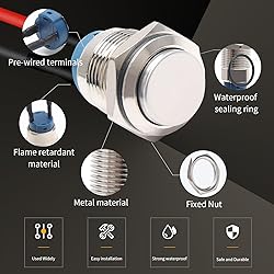 - STARELO 5pcs 16mm Latching Push Button Switch Silver Shell with pre-Wiring, IP65 Waterproof Push Button Switch,Stainless Steel 1 Normally Open Without LED.