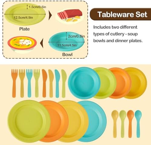 - Realistic Dishes for Play Kitchen: Kitchen playset are designed to the real kitchen set accessories and the size are suitable for children. Kids can pretend to pour/drink tea or use the plate to drink soup and cut food etc. Make your kids love eating with this tableware, learn about table manners.