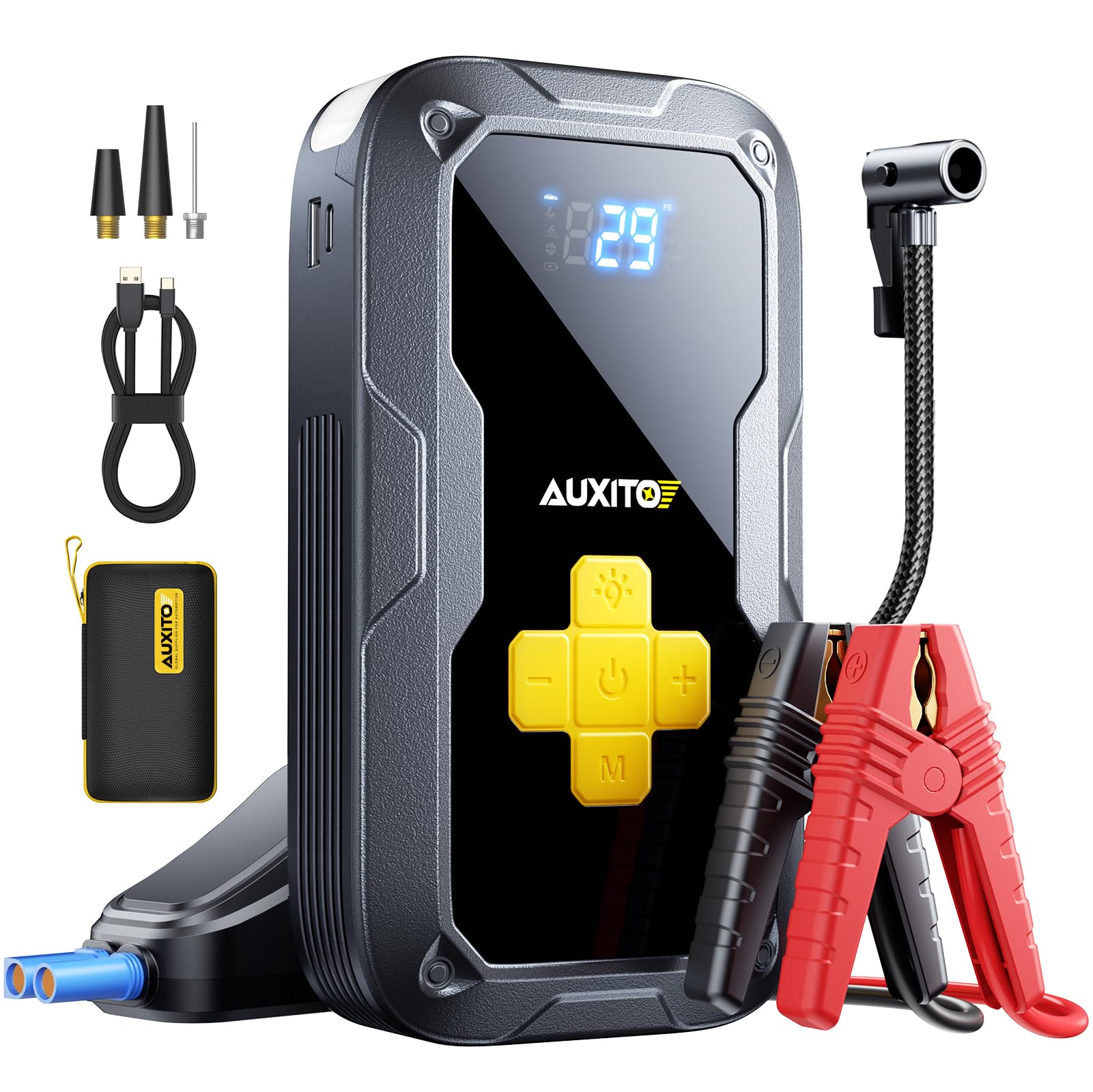 - Powerful Jump Starter: AUXITO jump starter with air compressor features the latest QDSP technology, providing a 6000A current for jump-starting vehicles over 60 times on a single charge. With over 1000 recharge cycles, it's a reliable lifesaver for all 12V cars( Up to all gas and 8L diesel engines)